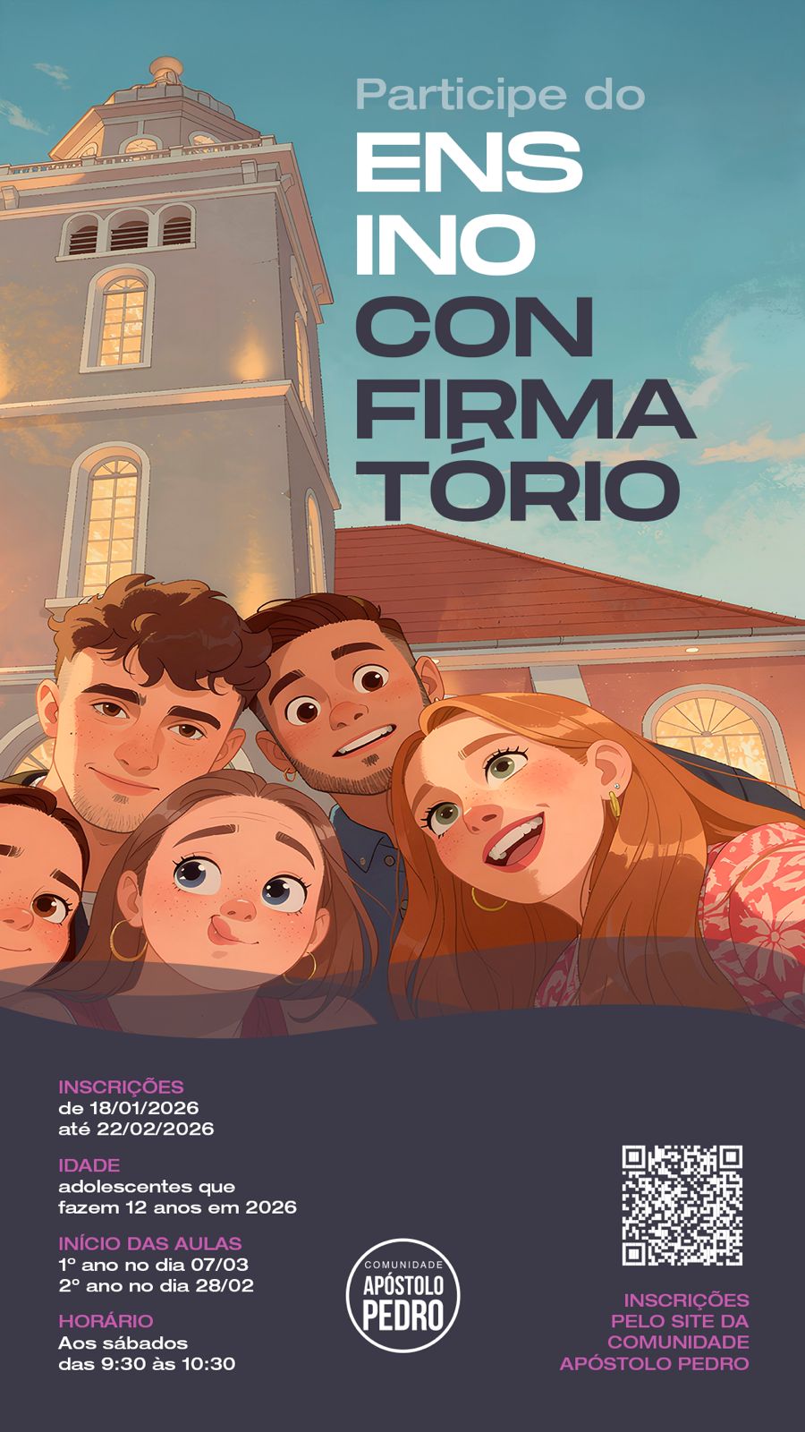 Aulas do 1° ano iniciam dia 07/03/2026, das 9:30 às 10:30 Aulas do 2° ano iniciam dia 28/02/206, das 9:30 às 10:30 O retiro acontecerá dias 28 e 29/03/2026 O valor contempla a inscrição do retiro do ensino confirmatório e material das aulas.